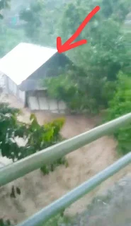 Lokasi banjir bandang yang menerjang kecamatan yang terletak di dataran tinggi ini, terlihat sangat besar 1 unit Rumah Panggung warga yang hanyut.
